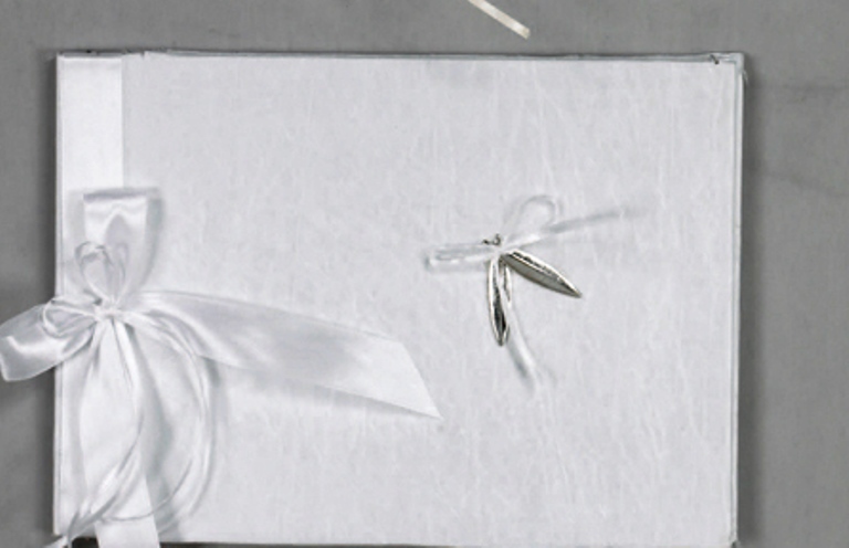 Λευκό βιβλίο ευχών γάμου με επάργυρα φύλλα ελιάς ως βασικό διακοσμητικό και λευκή φαρδιά κορδέλα σατέν.Το βιβλίο ευχών συνοδεύεται με στυλό λευκό.