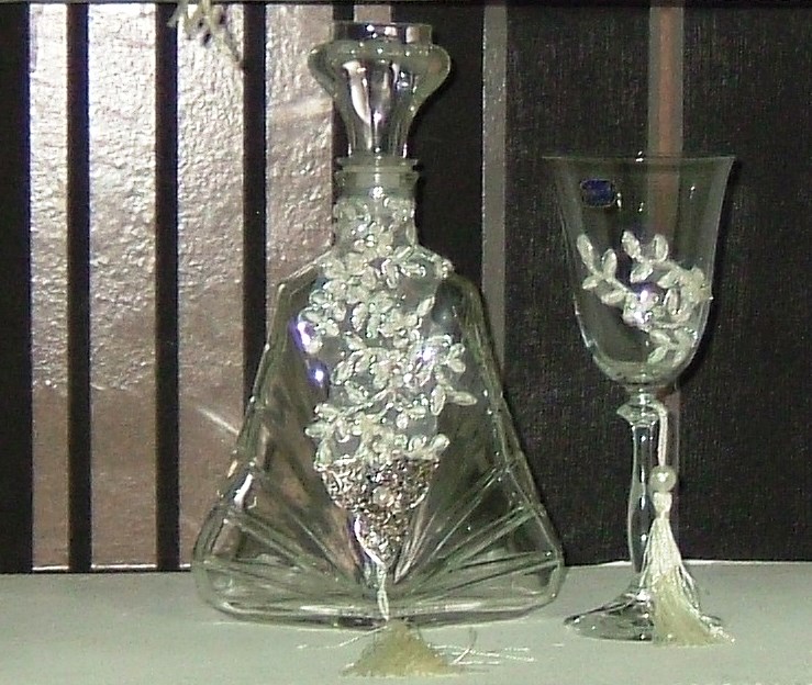 Σετ ποτήρι καράφα vintage με δαντέλα και δίσκος για το γάμο σας στολισμένα σε ύφος vintage με δαντέλα και μεταλλικό διακοσμητικό.Όμορφη ιβουάρ ανάγλυφη δαντέλα με strass στολίζει την καράφα και ποτήρι ο δίσκος με ρετρό χερούλι ολοκληρώνει το σετ του γάμου σας.